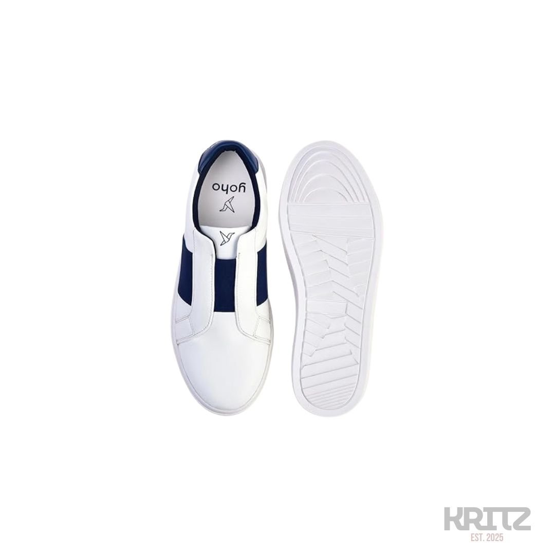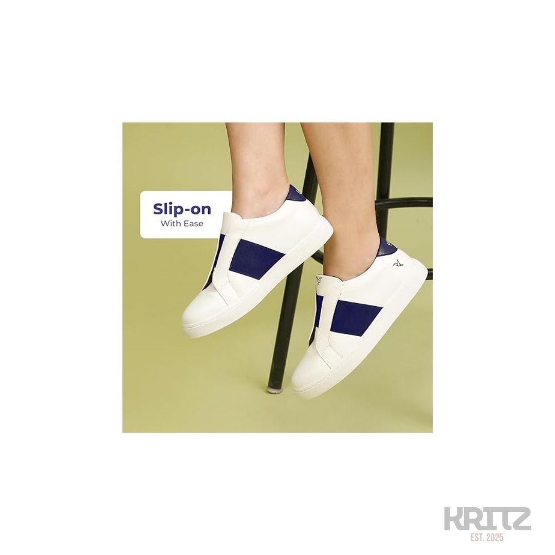 White Slip-On Sneakers with Navy Blue Stripe are designed for people who want comfort with a clean and modern style. These sneakers are easy to wear, lightweight, and perfect for daily use, college, office casuals, and travel. The soft inner lining keeps your feet relaxed, while the strong sole gives good grip on different surfaces. The navy blue stripe adds a smart touch, making these shoes easy to match with jeans, chinos, and casual outfits.